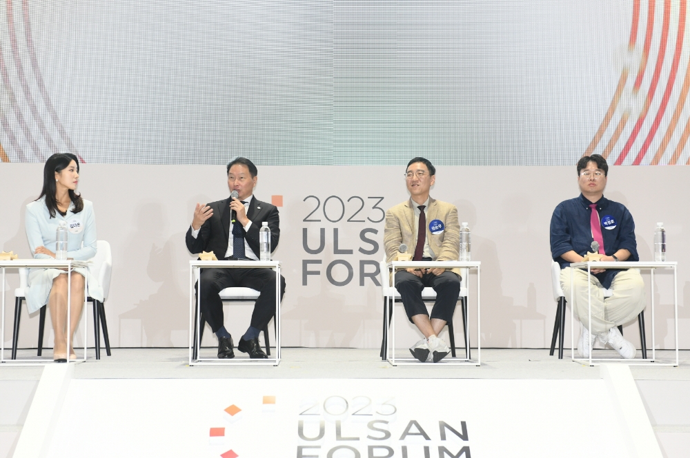 이미지 확대보기SK그룹은 울산 울주군 울산전시컨벤션센터에서 'ESG, 함께 만드는 울산의 미래'를 주제로 열린 2023 울산포럼을 성공적으로 마쳤다고 15일 밝혔다. 이번 포럼에는 최 회장을 비롯해 김준 SK이노베이션 부회장 등 SK 경영진과 김두겸 울산광역시장, 김기환 울산시의회 의장, 이윤철 울산상공회의소 회장, 오연천 울산대 총장 등이 참석했다.