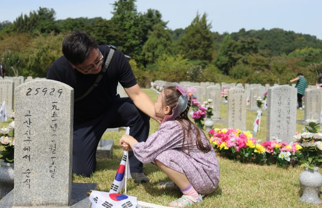 이미지 확대보기LIG넥스원 임직원 가족들이 제75회 국군의 날을 앞두고 23일 국립서울현충원을 찾아 현충탑에 참배하고 자매결연 묘역인 30묘역에서 묘역정화활동을 진행하고 있다. 사진=LIG넥스원