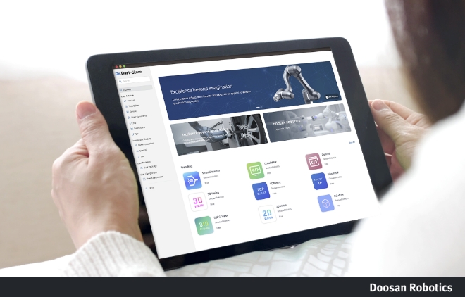 이미지 확대보기두산로보틱스는 협동로봇 애플리케이션을 개발하고 공유할 수 있는 소프트웨어 플랫폼 ‘다트 스위트(Dart Suite)’를 출시했다고 10일 밝혔다.
