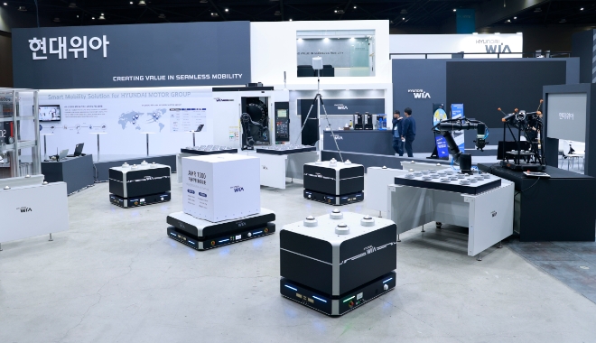 현대위아는 전시회 현장에 '스마트 제조 물류 설루션 존'을 설치, 실제 제조 현장에서 AMR과 협동로봇이 스스로 일하는 모습을 선보인다. 1톤급 AMR 1대와 300㎏급 AMR 3대, 협동로봇 3대를 활용해 창고에서 부품을 스스로 꺼내고, 가공과 검사 과정을 거쳐 다시 창고로 입고하도록 했다. 현대위아는 '실시간 통합 관제 시스템(ACS)'을 통해 서로 다른 AMR이 최적의 경로로 일할 수 있도록 했다.