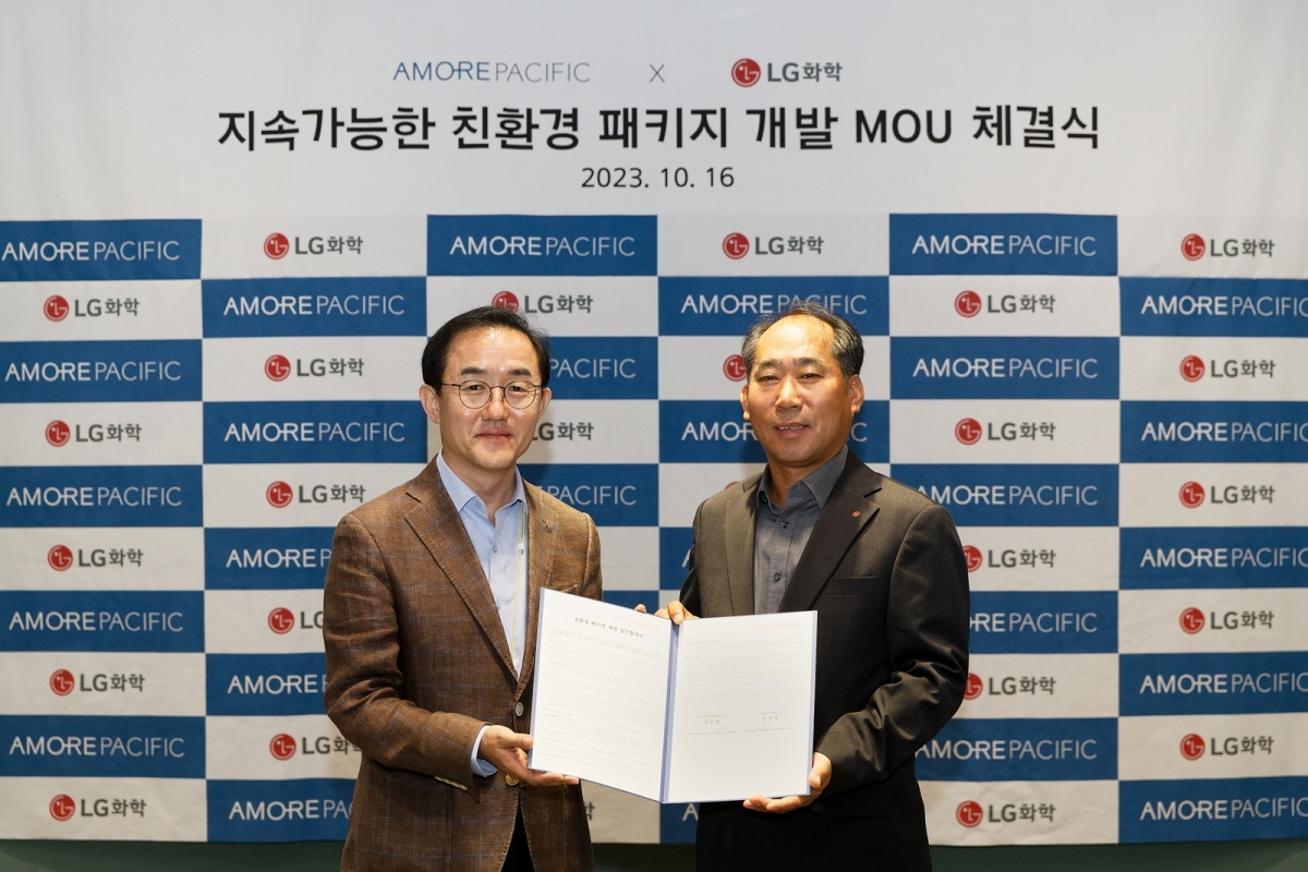 이미지 확대보기LG화학은 지난 16일 서울 용산 아모레퍼시픽 본사에서 아모레퍼시픽과 친환경 패키지 개발 및 공급을 위한 업무 협약을 체결했다고 17일 밝혔다.