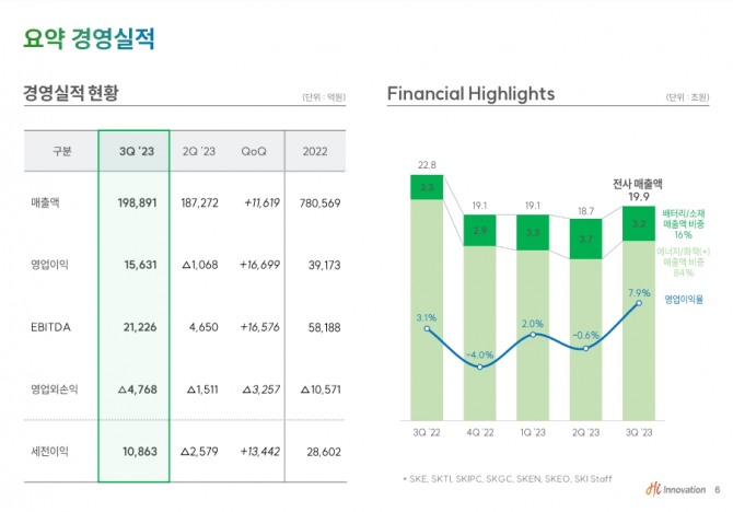 이에 대해 SK이노베이션은 "OPEC플러스의 감산 등 영향으로 유가와 정제마진이 동반 상승하며 석유 사업의 영업이익이 대폭 개선됐다. 화학 사업은 납사 가격 상승에 따른 재고관련이익 증가, 윤활유 사업의 원재료 가격상승에 따른 재고 효과, 배터리 사업 생산성 증대에 따른 수익성 개선세가 더해져 2023년 분기 최대 매출액과 최대 영업이익을 동반 달성했다"고 했다.