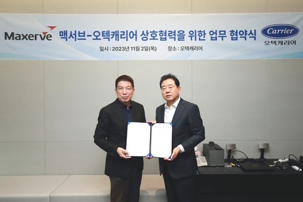 이번 업무 협약식은 지난 2일 여의도 오텍캐리어 IFC 본사에서 정필경 오텍캐리어 부회장과 손재익 맥서브 대표이사 등이 참석한 가운데 진행됐다. 이번 협약으로 양사는 탄소 배출량 저감과 실질적인 에너지 절감 방안 도입 확대 등 에너지 비즈니스 확장을 위해 협력한다.