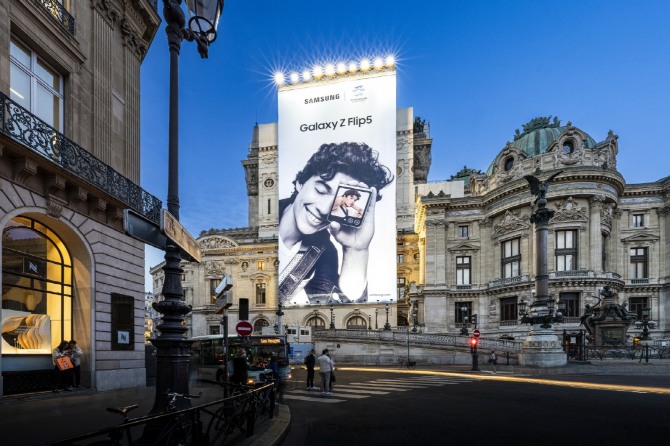 이미지 확대보기삼성전자는 국립 오페라 극장 '오페라 가르니에'의 대형 옥외광고에 '갤럭시 Z 플립5' 이미지와 함께 부산엑스포 로고를 함께 선보이고 있다고 26일 밝혔다. 이외에도 샤를드골 국제공항 입국장에서 14개 대형 광고판을 통해 부산엑스포 유치를 응원하는 광고를 집중적으로 실시하고, 파리 내 주요 매장에서도 부산엑스포 홍보 영상을 상영해 왔다.