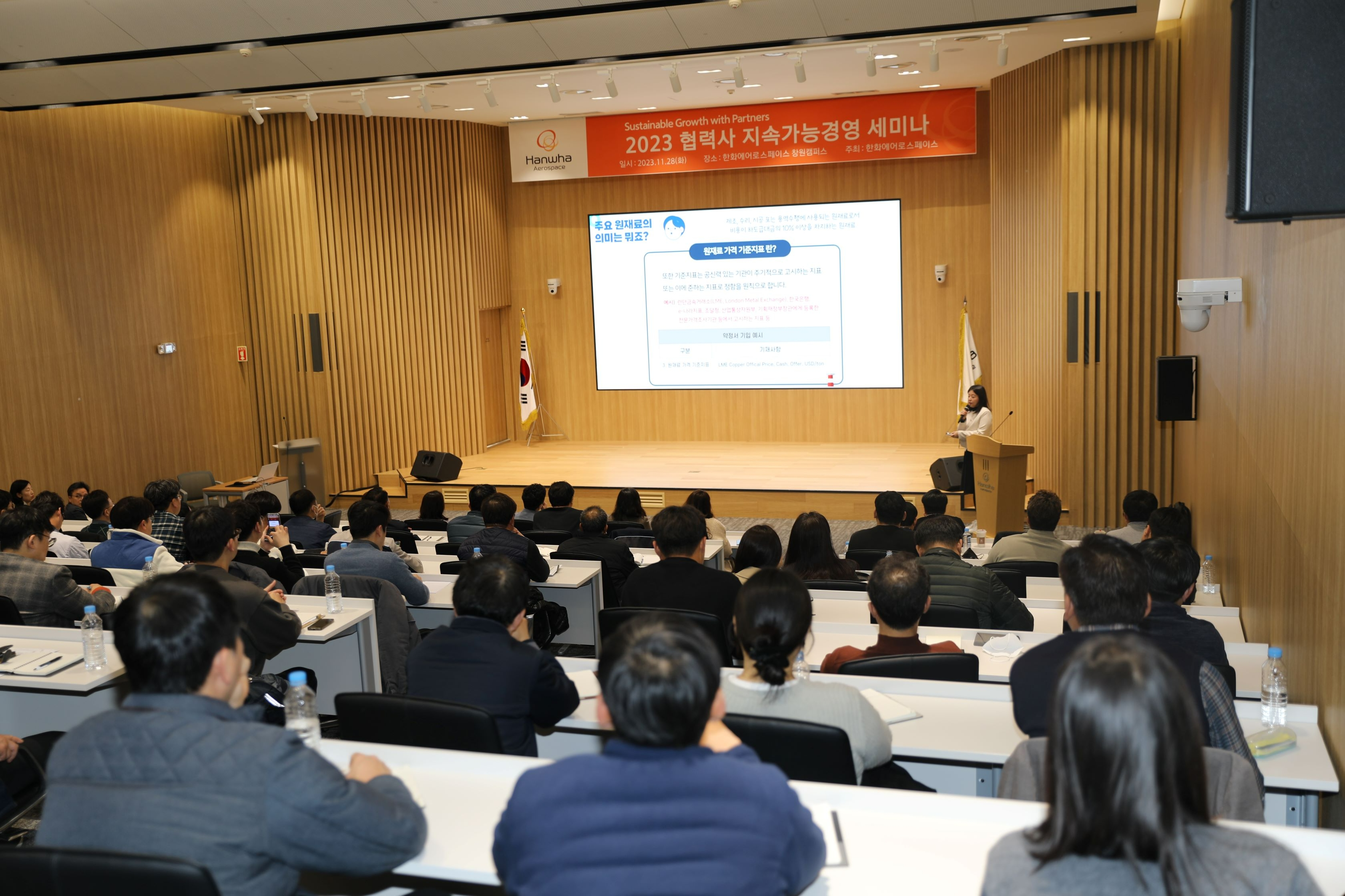 한화에어로스페이스는 28일 창원 3사업장 글로벌캠퍼스 대강당에서 ‘2023년 협력사 지속가능경영 세미나’를 개최했다고 29일 밝혔다. 이번 세미나에서는 ‘EU(유럽연합) 공급망 실사법’ 시행과 글로벌 ESG 규제 강화 흐름에 발 맞춰 ESG 공급망 개념과 동향을 설명했다.
