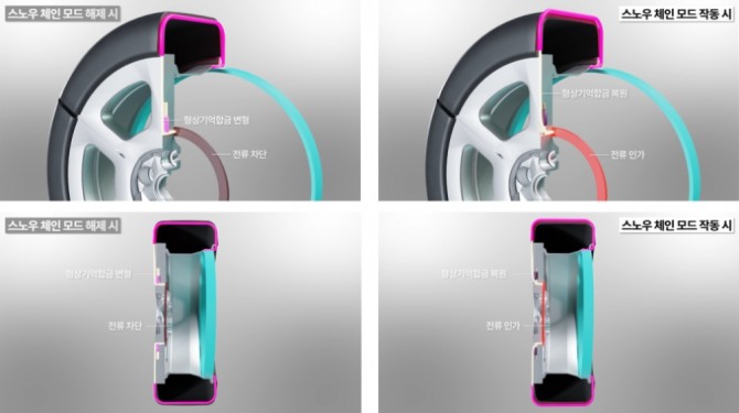 이 기술은 형상기억합금으로 이뤄진 모듈이 평상시에는 휠과 타이어 내부에 숨어있다가 전기적 신호를 받으면 타이어 바깥으로 돌출되며 스노우 체인의 역할을 하는 원리다.