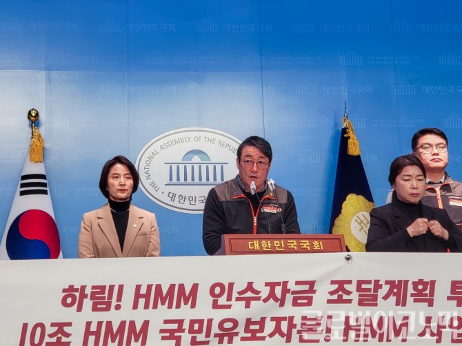 이미지 확대보기HMM해원연합노동조합(해상노조)과 전국사무금융서비스노동조합 HMM지부(육상노조)는 22일 국회의사당 소통관에서 'HMM 경영권 매각 관련 긴급 노동조합 기자회견'을 열고 정부에 "하림 우선협상대상자 선정 배경과 근거를 명확하게 공개할 것"을 요구했다.