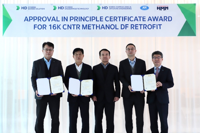 이미지 확대보기HD현대마린솔루션은 최근 한국선급(KR), HD한국조선해양, HD현대이엔티와 ‘공동개발 프로젝트’(JDP, Joint Development Project) 형식으로 수행한 ‘메탄올 이중연료 추진 개조 설계’가 한국선급으로부터 기본 인증(AIP)을 획득했다고 25일 밝혔다.
