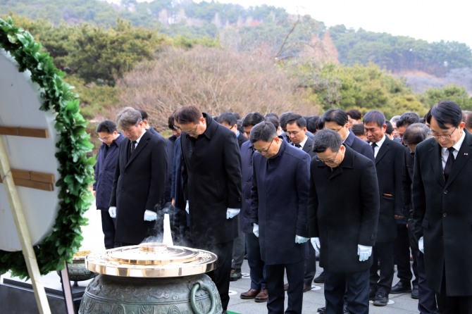 이미지 확대보기전날 오후 국립서울현충원에서 진행된 방산 계열사 3곳의 시무식에는 손재일 한화에어로스페이스 대표이사·어성철 한화시스템 대표이사·이용욱 한화오션 특수선사업부장 등 역대 최대 규모인 130여 명이 참석했다. 한화오션 임직원이 시무식에 참석한 것은 지난 5월 한화그룹에 편입된 이후 처음이다.