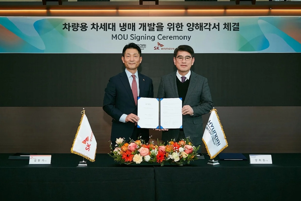 이미지 확대보기협약식에는 양희원 현대차 사장과 김원기 SK엔무브 사장 등이 참석하였다. 이번 협력은 글로벌 기업이 주도권을 쥐고 있는 차량용 냉매 시장에 국내 기업이 진출하는 사례로, SK엔무브는 냉매를, 현대자동차그룹은 냉매가 적용된 차량 열관리 시스템을 개발하는 방식을 채택하였다.