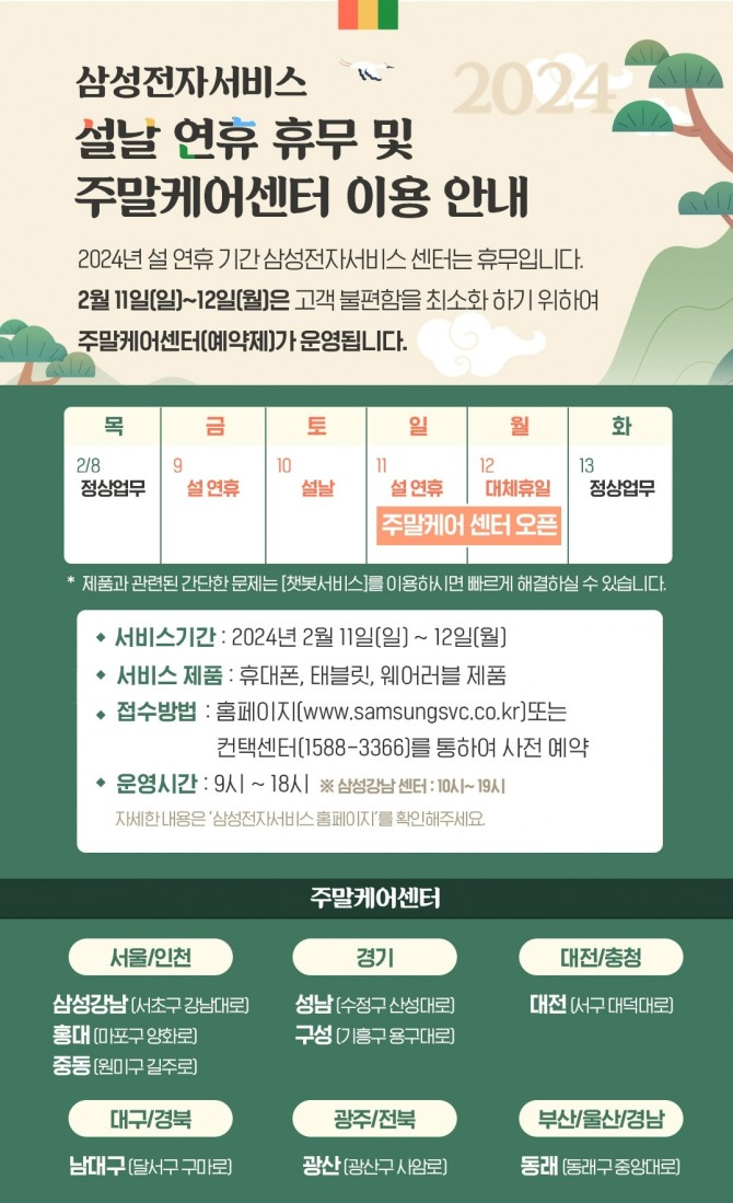 삼성전자서비스는 설 연휴에 대비해 홈페이지에 △제품 관리 요령 △고객이 많이 물어본 질문과 셀프 해결 방법 등을 게시하고, 컨택센터에서는 24시간 상담 서비스를 제공할 계획이다.