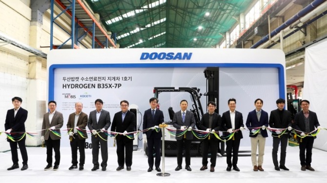 두산은 2024년 일부 국내 기업에 수소 지게차 30대를 시범적으로 공급할 계획이며, 올해 말 3톤급 모델(10kW 연료전지 탑재)의 인증을 완료할 예정이다.