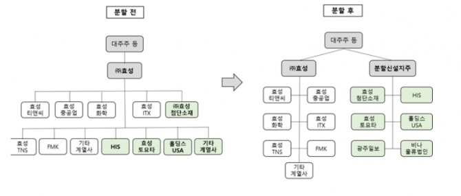 이에 따라 효성그룹은 오는 6월 임시 주주총회 회사분할 승인 절차를 거쳐 7월 1일자로 존속회사인 ㈜효성과 신설법인인 ㈜효성신설지주의 2개 지주회사 체제로 재편할 예정이다.