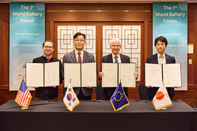이미지 확대보기한국배터리산업협회는 서울 그랜드인터컨티낸탈 파르나스 호텔에서 '세계배터리포럼(WBF)' 발족을 위해 한국·미국·유럽·일본 배터리 협회 간 업무협약(MOU)을 체결, 제1차 포럼을 한국배터리산업협회가 주관기관으로써 처음으로 개최했다고 4일 밝혔다.