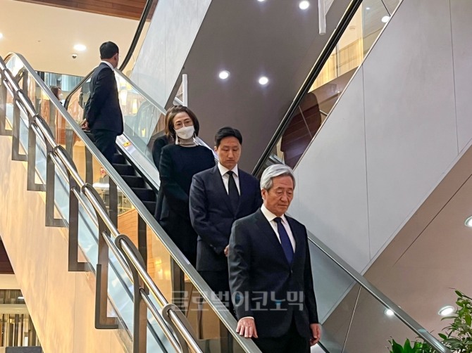 이미지 확대보기(오른쪽부터)정몽준 아산제단 이사장이 아들 정기선 HD현대 부회장과 부인 김영명 예솔 이사 등 가족들과 31일 오전 9시 30분경 고(故) 조석래 효성그룹 명예회장의 빈소가 마련된 서울 신촌세브란스병원 장례식장에 들어서고 있다. 사진=김정희 글로벌이코노믹 기자