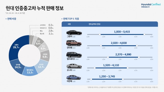 이미지 확대보기현대차는 9일 지난해 10월 시작한 인증중고차 사업에서 지난달까지 누적판매 기준 현대브랜드 전체 판매량의 29.7%가 그랜저였다고 9일 밝혔다. 이어 싼타페(14.5%), 팰리세이드(13.2%) 순서로 판매 비중이 높았다.