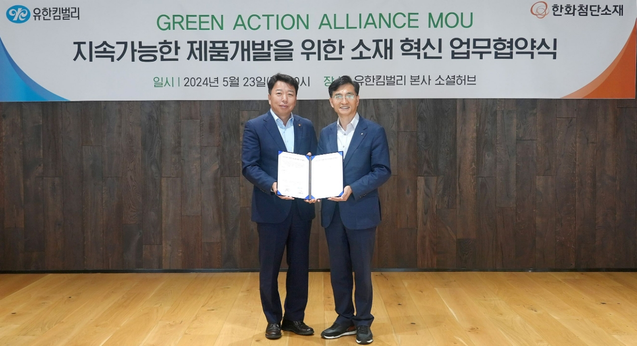 이미지 확대보기한화첨단소재는 유한킴벌리와 서울 송파구에 있는 유한킴벌리 본사에서 '그린 액션 얼라이언스'에 참여하는 업무협약(MOU)을 체결했다고 23일 밝혔다.