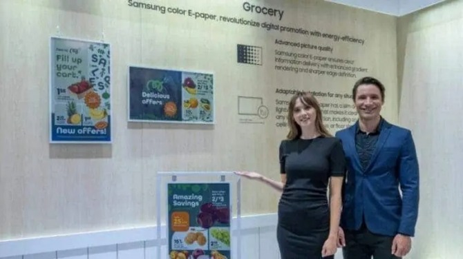 이미지 확대보기32인치 크기의 이 디스플레이는 QHD 해상도와 6만 가지 색상 표현을 지원하며, 두께 17.9mm, 무게 2.9kg(배터리 제외)으로 얇고 가볍다. 특히 콘텐츠 표시 중에는 전력 소모가 거의 없고 업데이트 시에만 소량의 전력을 사용하는 초저전력 기술이 특징이다. 국제전기기술위원회(IEC) 기준에 따라 0W 소비 전력으로 표시될 정도로 에너지 효율성이 뛰어나다.
