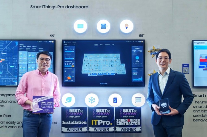 인포콤 2024에서 글로벌 출시를 알린 기업간거래(B2B) 전용 통합 연결 플랫폼 '스마트싱스 프로'는 다양한 비즈니스 환경 요구를 고려한 서비스 강화 등 기업 솔루션으로 혁신성을 인정받아 5관왕에 올랐다.