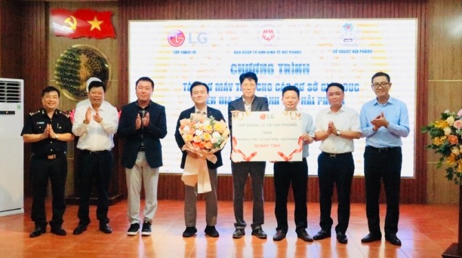 이미지 확대보기하이퐁 교육훈련부는 25일 LG그룹, 하이퐁 경제구역 관리위원회와 함께 컴퓨터 기증 컨퍼런스를 개최했다. 이를 통해 LG그룹은 르퀴돈 고등학교에 컴퓨터를 기증하게 되었다.
