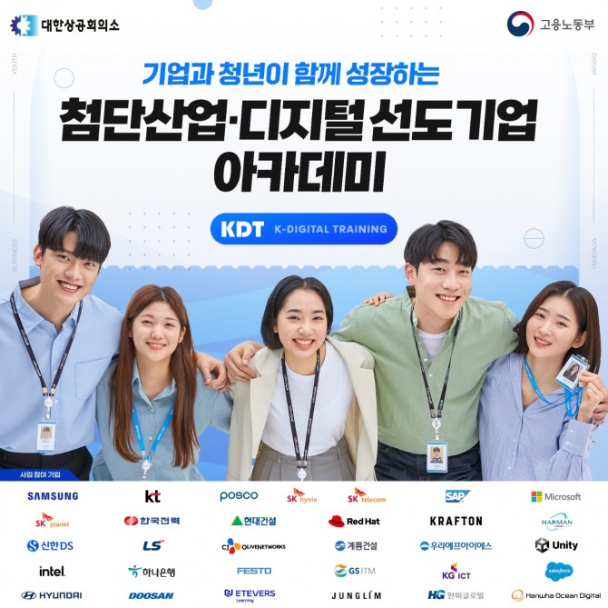 이미지 확대보기K-디지털 트레이닝(K-Digital Training, KDT)의 '첨단산업·디지털 선도기업 아카데미'는 고용노동부가 주관하고, 대한상공회의소가 운영을 지원하는 민관 협력 소프트웨어(SW) 인재 양성 사업이다. 교육 커리큘럼을 기업이 직접 설계·운영해 실무에 적합한 창의 융합형 인재를 육성하는 게 특징이다.