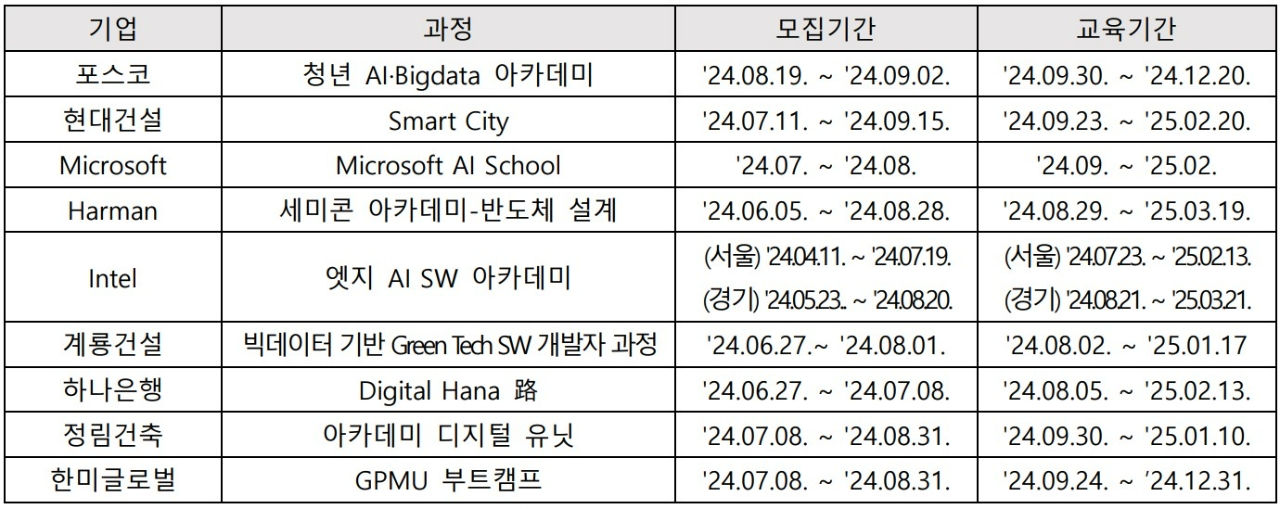 이번에 교육생을 모집하는 기업은 △포스코 △현대건설 △마이크로소프트 △하만 △인텔 △계룡건설 △하나은행 △정림건축 △한미글로벌 총 9곳이다.
