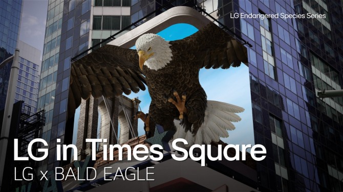 이미지 확대보기2일(현지시간) LG전자에 따르면, 이번 캠페인은 지난 4월부터 시작된 'LG 멸종위기종 시리즈'의 일환으로, 멸종 위기에 처했던 대머리독수리가 성공적인 보호 노력을 통해 다시 번성하게 된 이야기를 담고 있다. 특히 실감 나는 3D 영상은 마치 대머리독수리가 타임스퀘어를 활공하는 듯한 착각을 불러일으키며 시민들의 관심을 끌고 있다.