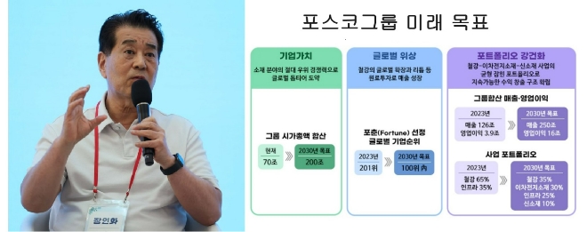 대신, 장 회장은 전 세계 기업 중 유일하게 포스코홀딩스와 포스코퓨처엠을 축으로 포스코그룹이 수직계열화를 이뤄낸 이차전지소재 비중을 2030년까지 30%로, 신규 투자하는 신소재도 비중을 10%로 끌어올리겠다고 했다. 금액으로 환산하면 각각 약 75조원, 약 25조원으로 합하면 100조원에 달해 철강을 넘어선다.