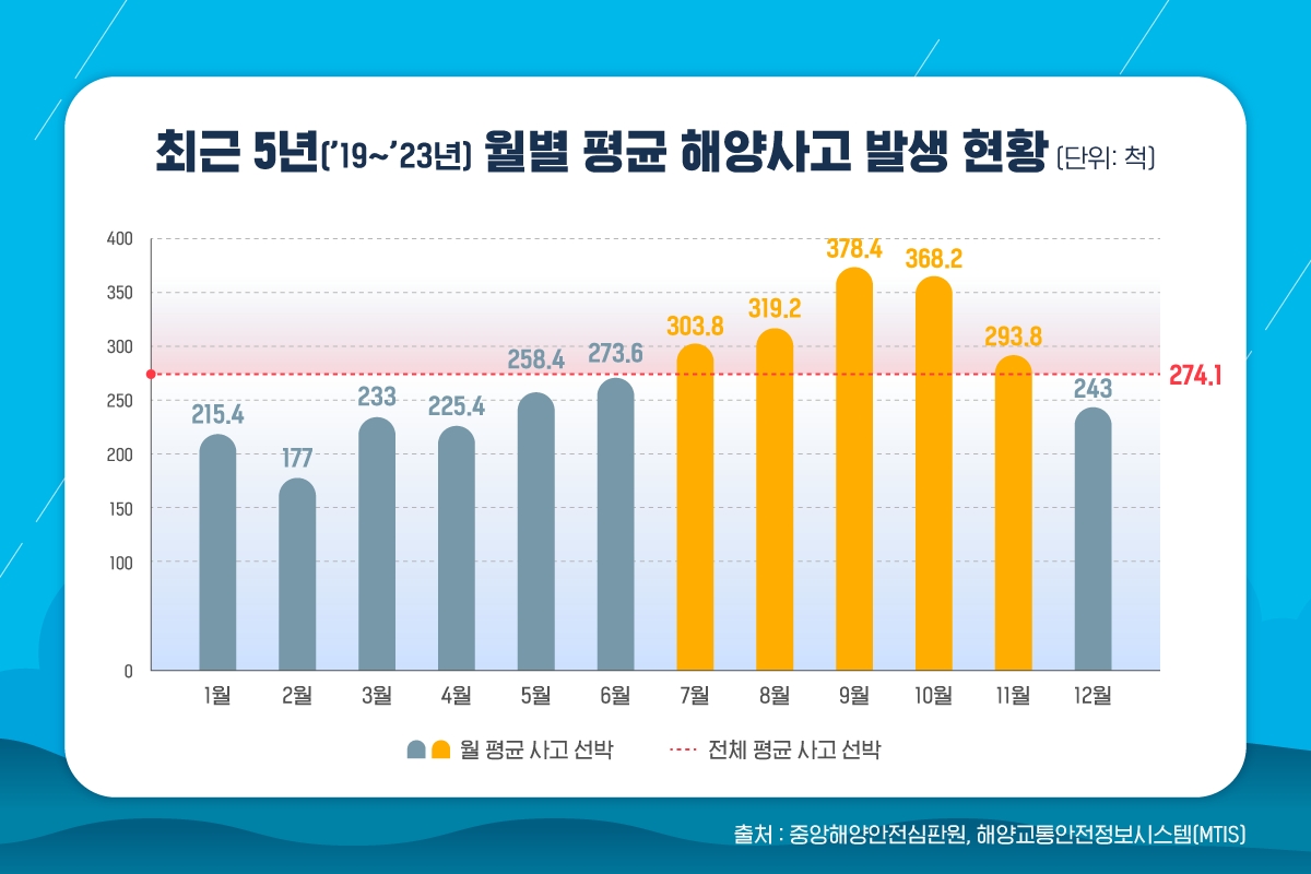 공단이 해양교통안전정보시스템(MTIS)을 활용해 최근 5년(2019~2023년)간 월별 해양사고를 분석한 결과, 7월부터 11월까지 해양사고는 △7월 202.9척 △8월 319.2척 △9월 378.4척 △10월 368.2척 △11월 294.8척으로 연간 평균(274.1척)을 상회하는 것으로 나타났다.