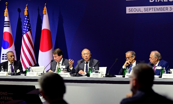 이미지 확대보기한미일 경제대화에 참석한 (왼쪽 세 번째)정의선 현대차그룹 회장이 인사말을 하고 있다. 사진=현대차그룹
