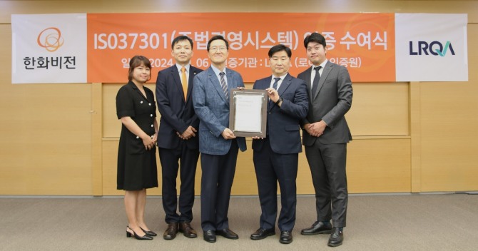 이미지 확대보기한화비전은 국내 영상보안 업계 최초로 규범준수경영시스템 'ISO 37301' 인증을 획득했다고 9일 밝혔다. ISO 37301은 회사 경영 전반에 필요한 컴플라이언스(준법) 정책과 리스크 대응 체계가 글로벌 수준에 부합하고 효과적으로 운영되는지 평가하는 ISO 인증이다.