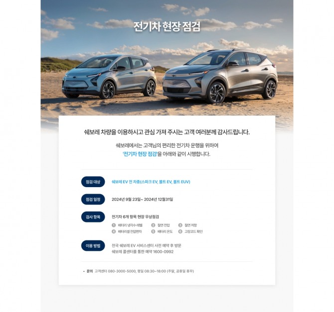 27일 관련업계에 따르면 제너럴 모터스 한국사업장(한국지엠)이 23일부터 12월 31일까지 전기차 현장 점검을 실시한다. 이번 전기차 현장 점검은 쉐보레 및 캐딜락의 전기차 모델을 소유한 고객을 대상으로 진행되며, 점검 예약 방법은 각 브랜드 홈페이지의 이벤트 안내 페이지를 통해 확인할 수 있다.
