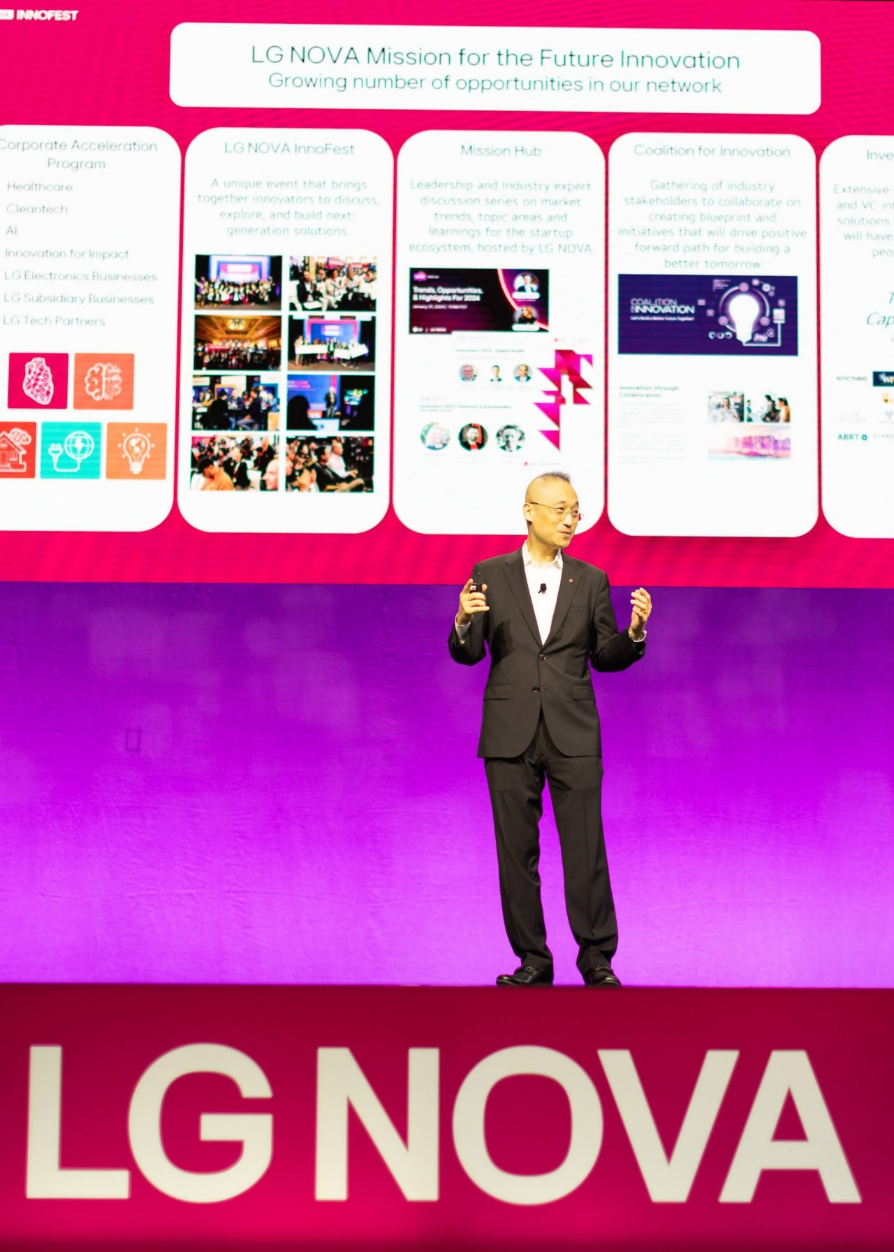 올해는 ‘혁신의 등불을 밝히다’를 주제로 AI와 클린테크, 헬스케어 등 미래 산업에서 더 나은 미래를 만들 혁신의 열쇠를 찾았다. 먼저 사전 선발된 10개 스타트업이 심사위원과 청중 앞에서 비즈니스 아이디어를 겨루는 '스타트업 피치 대회'가 열렸다. 최종 우승을 차지한 스타트업에는 상금과 LG NOVA의 마케팅 지원 외에도 LG 계열사 협력과 및 글로벌 투자사의 투자 유치 기회가 주어진다.