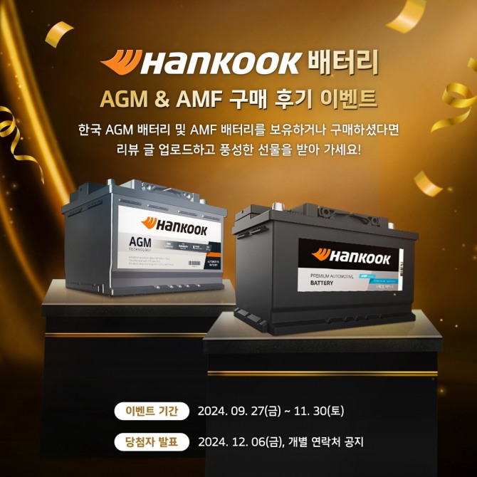 참여 대상은 고성능·고효율 시스템 차량에 최적화된 '한국 AGM·AMF 배터리'를 구매한 고객이다. 한국 AGM 배터리는 최신 '스탑앤고' 시스템과 하이브리드 파워트레인이 탑재된 차량에 최적화된 제품이다. 한국 AMF 배터리는 발전 제어 시스템을 적용한 차량에 맞춰 개발됐다.