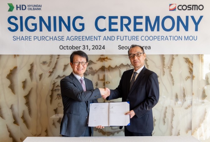 이미지 확대보기HD현대오일뱅크는 일본 코스모오일과 'HD현대코스모 지분 인수 계약'을 체결했다고 31일 밝혔다. HD현대코스모는 2009년 HD현대오일뱅크와 코스모오일이 50%씩 출자해 설립된 합작회사다. 석유화학제품 원료인 파라자일렌(PX)을 주로 생산해왔다.