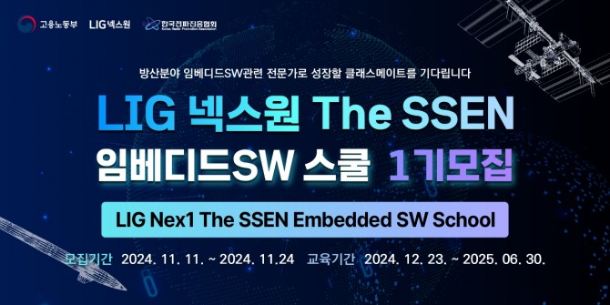‘LIG넥스원 The SSEN 임베디드SW 스쿨 1기’ 프로그램은 내일배움카드를 발급 받을 수 있는 자격이면 누구나 신청 가능하며, 이달 24일까지 모집한다. 교육과정 신청은 LIG넥스원 채용 홈페이지와 한국전파진흥협회 DX캠퍼스 홈페이지를 통해 지원할 수 있다.