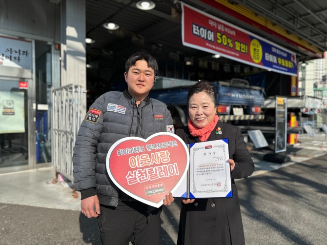 이미지 확대보기타이어뱅크는 17일 부산 서구 동대신동 타이어뱅크 구덕운동장점에서 신 이사장에게 감사장과 타이어 교환권을 전달했다.