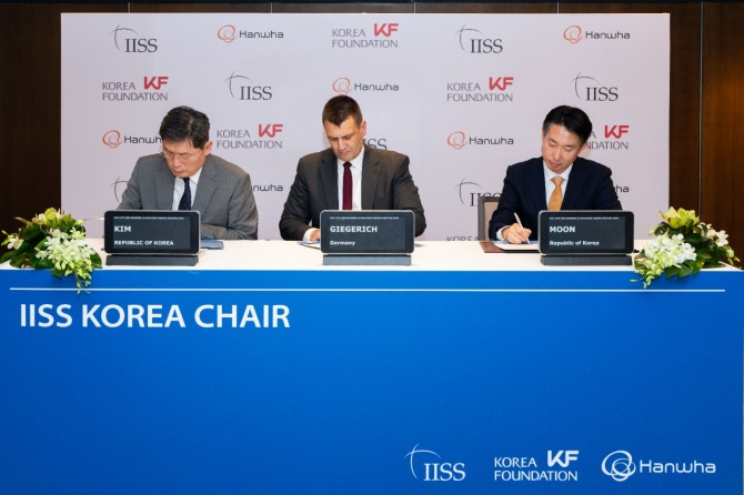 이미지 확대보기한화그룹은 20일 싱가포르 샹그릴라 호텔에서 KF, IISS와 함께 ‘코리아 체어’를 신설하는 내용의 서명식을 진행했다고 23일 밝혔다.