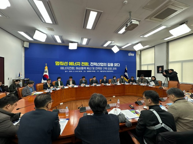 이미지 확대보기5일 서울 여의도 국회에서는 민주당 민생경제회복단이 주최한 '제7차 현장·전문가 간담회'가 열렸다. '멈춰선 에너지전환, 전력산업의 길을 찾다'라는 주제로 개최된 이번 간담회에서는 에너지전환, 해상풍력 확산 등을 위한 입법과 정책 과제에 대한 논의가 이뤄졌다. 이날 간담회에는 박찬대 더불어민주당 원내대표를 비롯해 전력산업 전문가들이 참석했다.