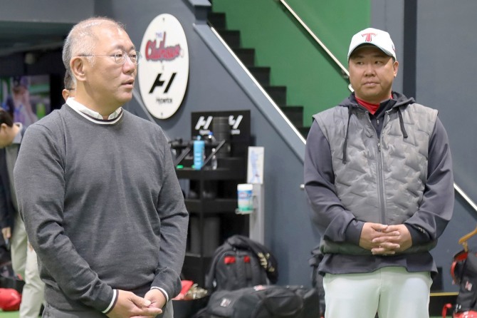이미지 확대보기17일 현대차그룹에 따르면 정 회장은 16일(현지 시각) 미국 캘리포니아주 어바인 인근의 '더 클럽하우스 베이스볼'을 찾아 2년 연속 우승을 위해 훈련 중인 KIA 선수들과 코칭 스태프를 격려했다.