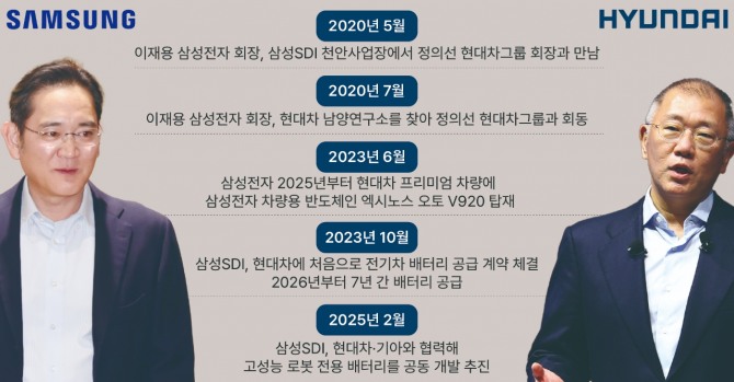 삼성과 현대자동차그룹이 로봇 전용 배터리 개발을 위해 손을 잡으면서 두 그룹의 '배터리 공조'가 한층 두터워지고 있다는 평가가 나온다. 2020년 이재용 삼성전자 회장과 정의선 현대차그룹 회장의 이른바 '배터리 회동' 이후 5년여 만에 양사 간 배터리 협업 영역이 전기차에서 로봇까지 확장했다는 것이다.