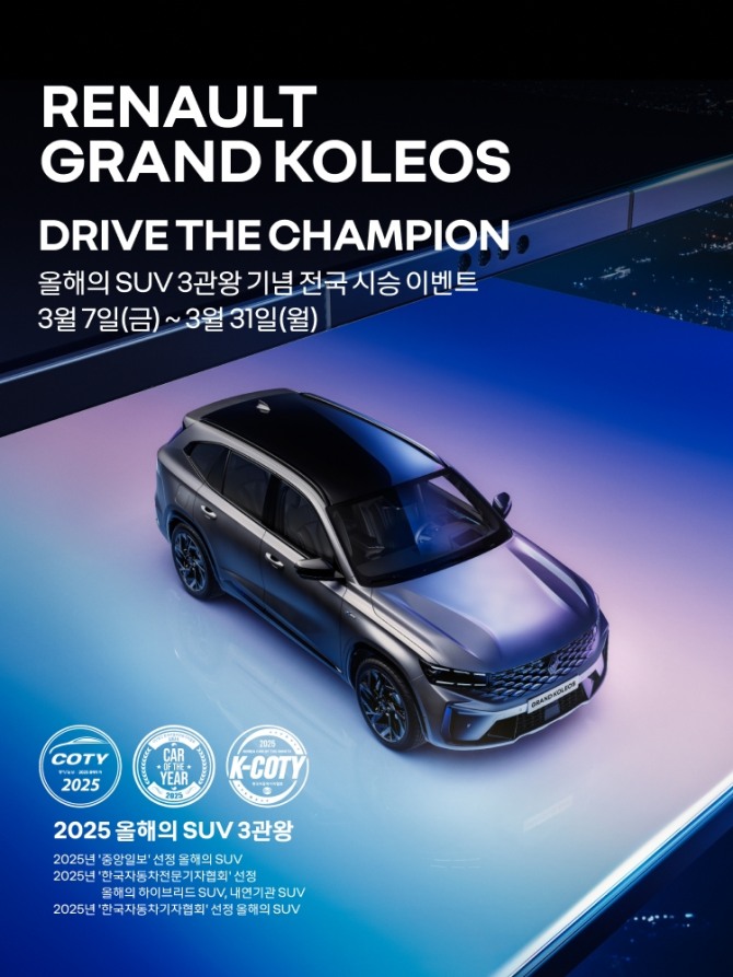 황재섭 르노코리아 영업 및 네트워크 총괄 전무는 “그랑 콜레오스가 2025년 ‘올해의 SUV’ 3관왕을 차지하며 성능에 대한 전문가들의 검증까지 마쳤다”며 “이를 기념해 보다 많은 고객들이 그랑 콜레오스의 우수한 성능, 다양한 기능과 매력을 느끼실 수 있도록 전국 전시장에서 열리는 시승 이벤트를 준비했다”고 말했다.