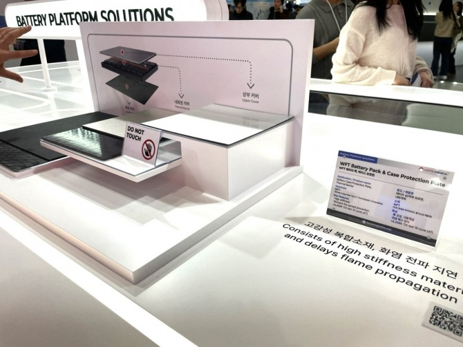 회사는 직조 장섬유 하이브리드 열가소성 복합재(WFT)로 제작한 배터리 팩과 케이스 보호판도 전시했다. 이차전지의 상·하부를 보호하는 판으로 외부 환경으로부터 배터리를 보호해 화염 확산을 방지한다. 이 제품 또한 전기차 화재로 인해 필요성이 커지고 있다. 5일 부스를 찾은 안덕근 산업통상자원부 장관도 이 제품을 눈여겨봤다. 현장의 한 관계자는 "우수한 내열성과 내구성으로 배터리 안전성을 유지해준다"며 "외부 충격으로부터 배터리를 보호하기 위해 직조 형태로 만들고 압축해 불이 나더라도 화염이 밖으로 나오지 않게 막아준다"고 설명했다.