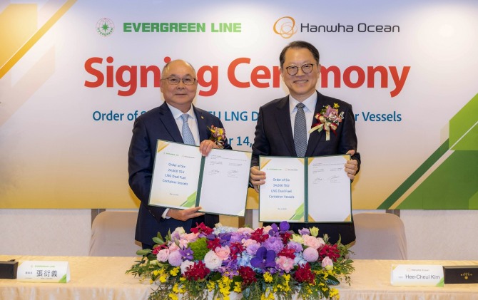 이미지 확대보기한화오션은 세계 최대 해운사 중 하나인 대만의 에버그린로부터 2만4000TEU((1TEU=20피트 컨테이너 1대)급 액화천연가스(LNG)이중연료추진 친환경 초대형 컨테이너선 6척을 수주했다고 17일 밝혔다. 에버그린은 200척 이상의 선대를 운영하는 세계 최대 컨테이너 전문 해운사 중 하나다.