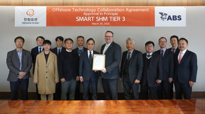 이미지 확대보기한화오션은 미국 선급 ABS로부터 '스마트 선체 구조 건전성 모니터링 티어 3'에 대한 개념 승인(AiP)을 획득했다고 21일 밝혔다. AiP는 새로운 기술이 안전하고 실현 가능하다는 것을 선박 검사 기관이 공식적으로 인정한 것을 말한다.