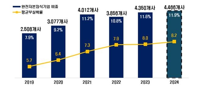 이는 2023년 부실기업 수인 4350개사보다 116개사(2.7%)가 증가하는 수치로 최근 6년(2019년~2024년) 중 가장 많은 숫자다.