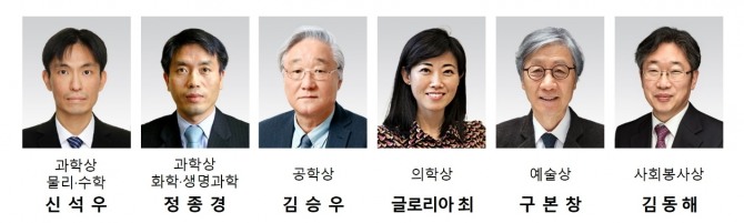 이미지 확대보기올해 수상자는 △과학상 물리·수학부문 신석우 미국 UC버클리 교수 △과학상 화학·생명과학부문 정종경 서울대 교수 △공학상 김승우 KAIST 명예교수 △의학상 글로리아 최 미국 MIT 교수 △예술상 구본창 사진작가 △사회봉사상 김동해 사단법인 비전케어 이사장 등 6명이다.