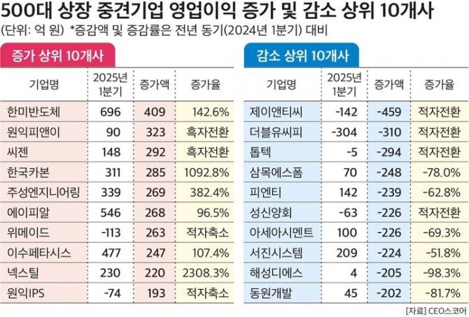 중견기업 중 한미반도체(409억원·142.6%)가 영업이익이 가장 크게 증가했다. 반면 제이앤티씨(-459억원·적자전환)는 1분기 영업이익이 가장 많이 줄었다.