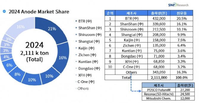 SNE리서치 관계자는 "2025년에도 중국 인조흑연의 강세 속에 중국 음극재 업체의 사용량이 지속적으로 유지 또는 강세를 이어갈 것"이라고 말했다.