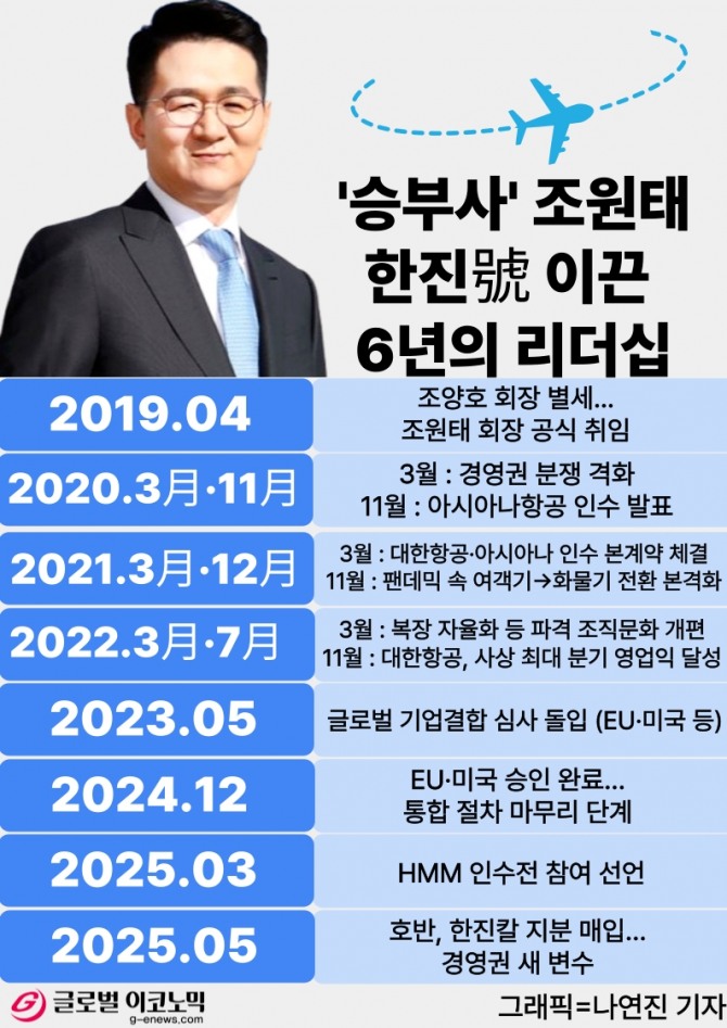 한진그룹은 2020년 아시아나항공 인수를 결정한 이후 항공산업 구조 개편의 선두에 섰다. 지난해 말 미국·유럽연합(EU) 등 주요 경쟁 당국의 조건부 승인을 확보한 데 이어 올해 1월 아시아나항공을 대한항공 자회사로 편입시켰다. 향후 진에어를 중심으로 에어부산·에어서울을 흡수 통합하는 2단계 절차가 예정돼 있다. 정부는 2026년 10월까지 완전 통합을 목표로 항공면허 통합 등을 단계적으로 추진할 방침이다.